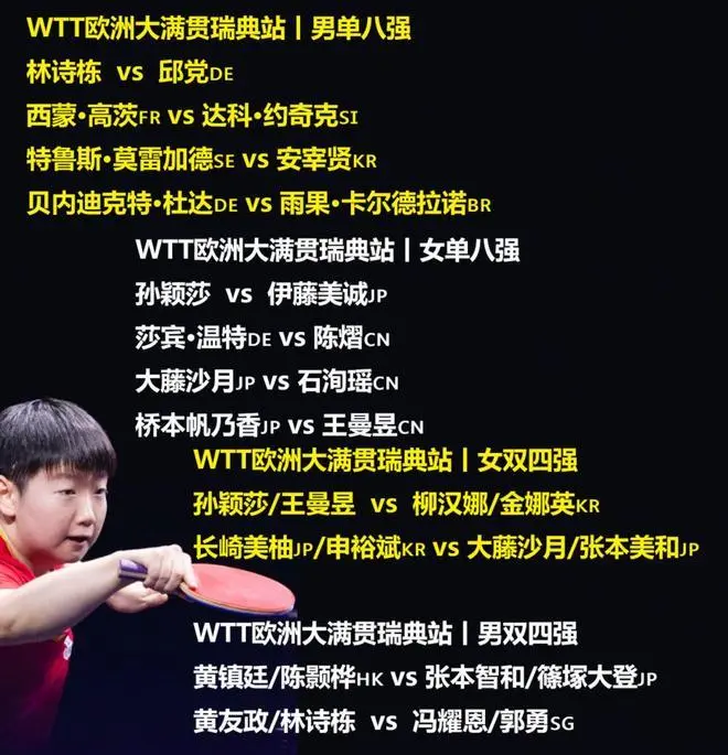 女单赛场则遭遇挫折,三位中国选手在1/8决赛中出局。陈幸同1-3不敌德国选手莎宾·温特,王艺迪同样以1-3的比分负于日本选手桥本帆乃香。石洵瑶虽以3-1战胜队友蒯曼,但随后在下一轮被淘汰。