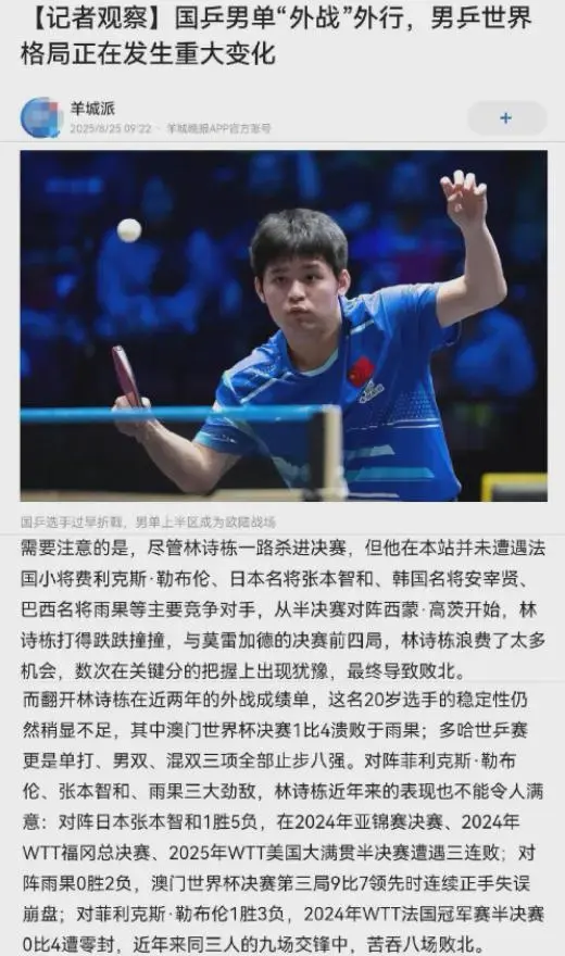 作为目前世界排名第一的选手,林诗栋近期的国际赛事表现引发关注。在澳门世界杯男单决赛中,他以1-4负于巴西选手雨果;多哈世乒赛上,他参加的三项赛事均止步八强。数据显示,近五场对阵张本智和的比赛输掉四场,与雨果和费利克斯-勒布伦的交锋记录也不理想。