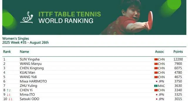 现行世界排名规则规定,运动员积分由过去12个月内八站最高赛事积分累加计算。在女单排名中,中国选手包揽前五名,分别为孙颖莎、王曼昱、陈幸同、蒯曼和王艺迪。日本新星张本美和与中国澳门选手朱雨玲分列第六、第七位。