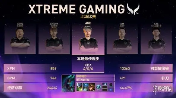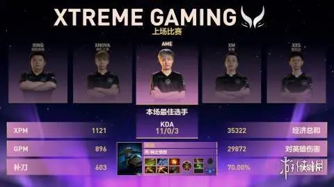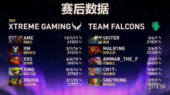 总决赛采用BO5赛制,XG在首局延续良好状态,通过团战优势先下一城。第二局Falcons利用BP优势拿到版本强势英雄"獸",全程压制XG扳平比分。第三局XG以毒狗针对对手核心英雄,Ame选手经济全场领先,帮助队伍2-1再度领先。