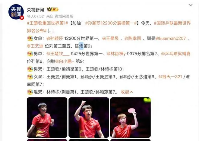 王楚钦此前因伤病等因素长期位居世界第二,本次通过澳门冠军赛实现突破。他在决赛中4-0战胜巴西选手雨果,获得1000积分,这也是他职业生涯第三次登顶世界第一。目前其与林诗栋的分差仅为50分,竞争态势依然胶着。