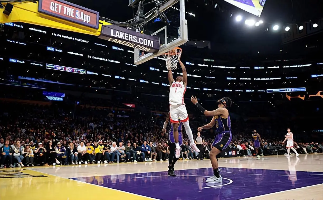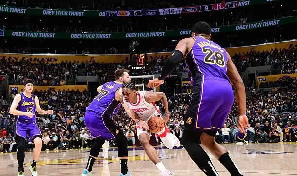 洛杉矶湖人主场104比98战胜休斯顿火箭 詹姆斯关键得分助球队获胜