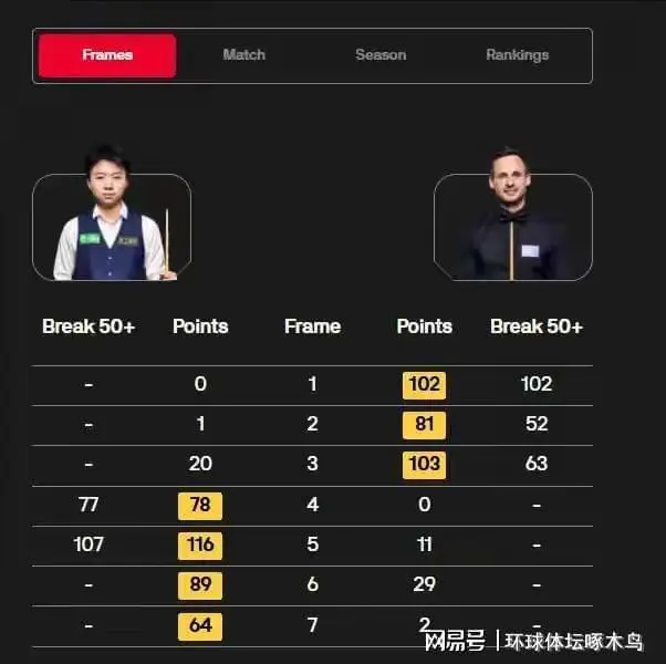 随后两局江俊状态持续提升,先后打出单杆77分和107分,将比分追至3-3平。这是江俊职业生涯首次在职业赛事中完成单杆破百,也是本届苏格兰公开赛的重要亮点之一。